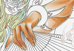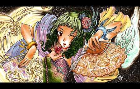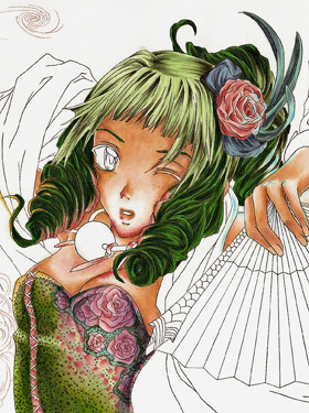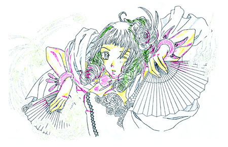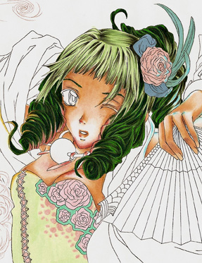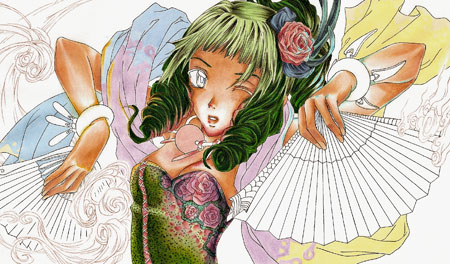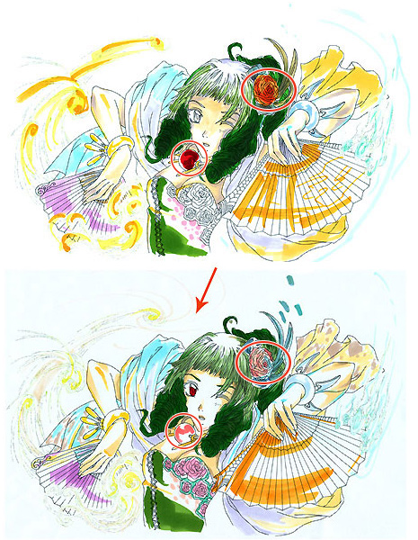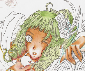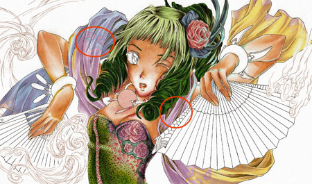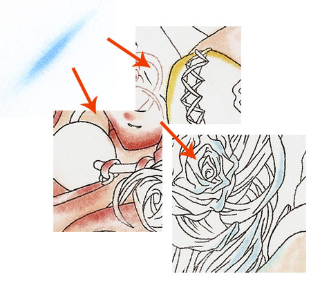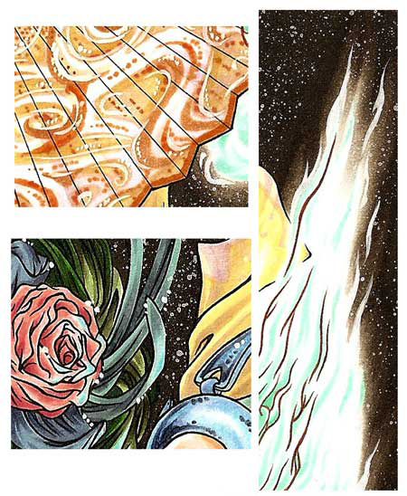 The little images show you what I added with the opaque white. I used the small round brush (size 00) to add details to the orange fan and little dots on the the flower in the hair or the eyes. I also enhanced the wind with it.