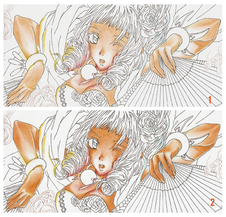 I gave a second coat to the bright areas on the orange fan with 475-T, added a subtle fade to the orange part and dots below with YR23 (brush nib).