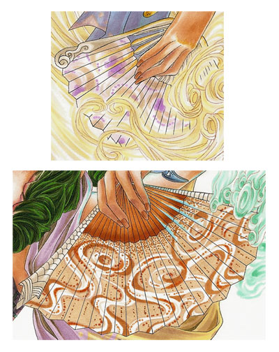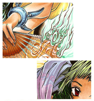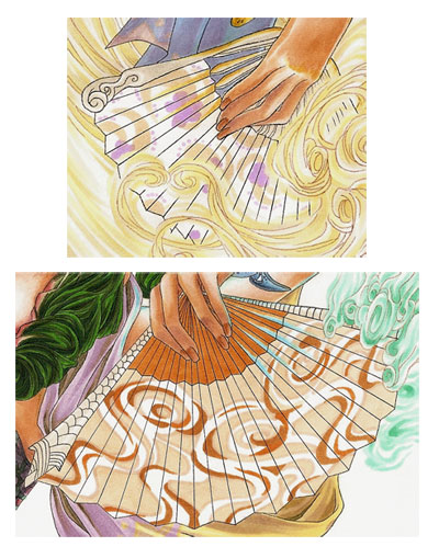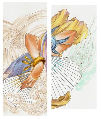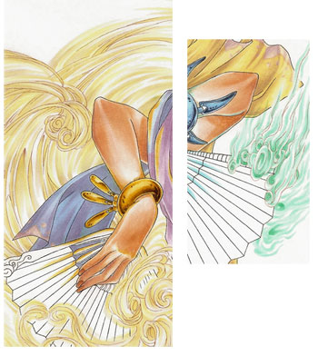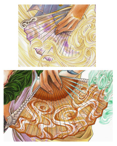 The last things I coloured before I went onto the background were the two fans. I decided that they should reflect the different types of wind which is why I drew a flowery pattern on the "violet" and a swirly pattern on the orange/brownish fan. Due to the fact that I wanted a more complicated pattern on the orange fan, I traced the fan shape on a separate piece of paper and added the pattern as a rough guide. Since marker paper tends to be very thin I just put the pattern directly under the original outlines so that the black lines were shining through. After that I used the colours according to the pattern. ;)